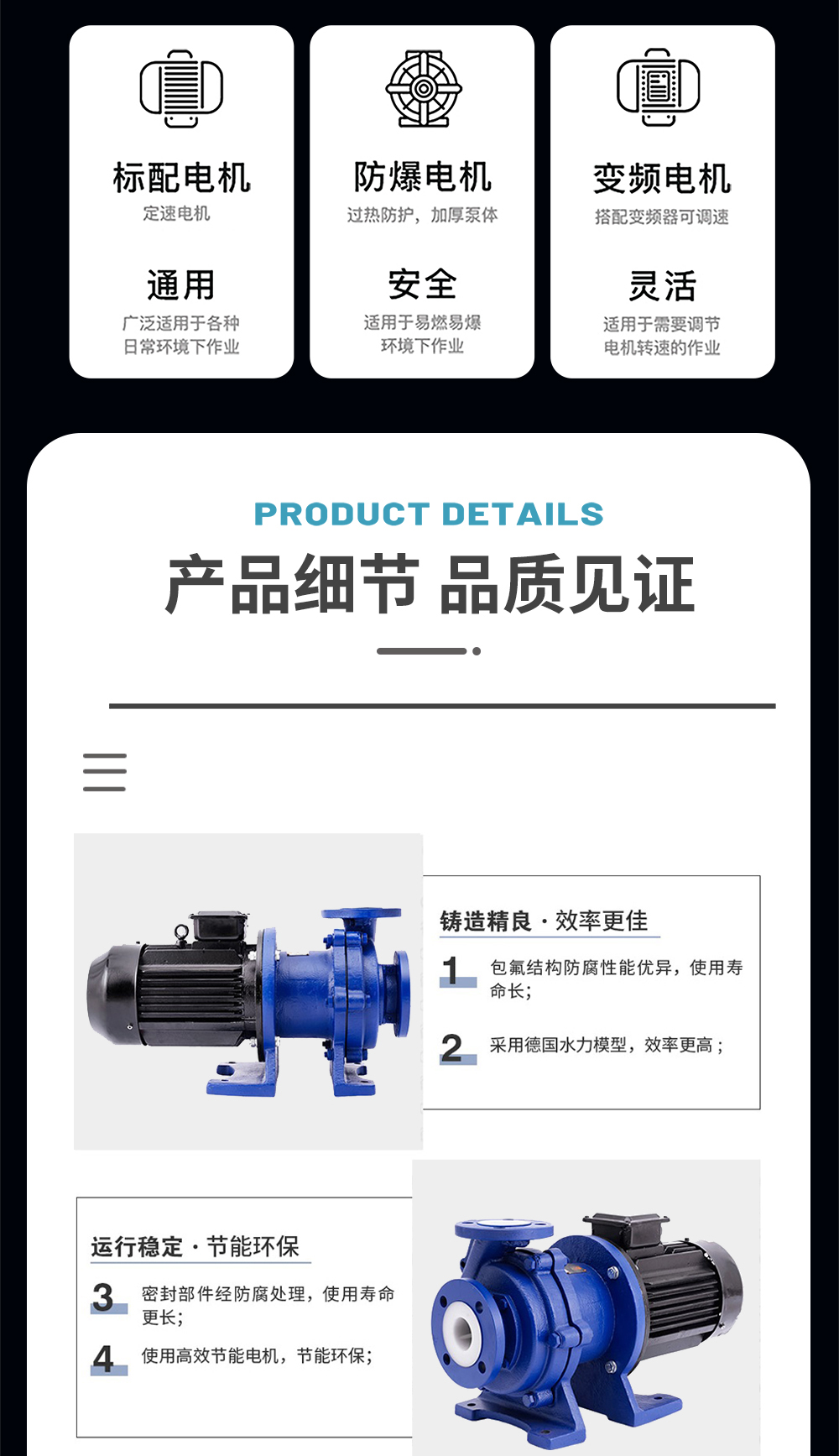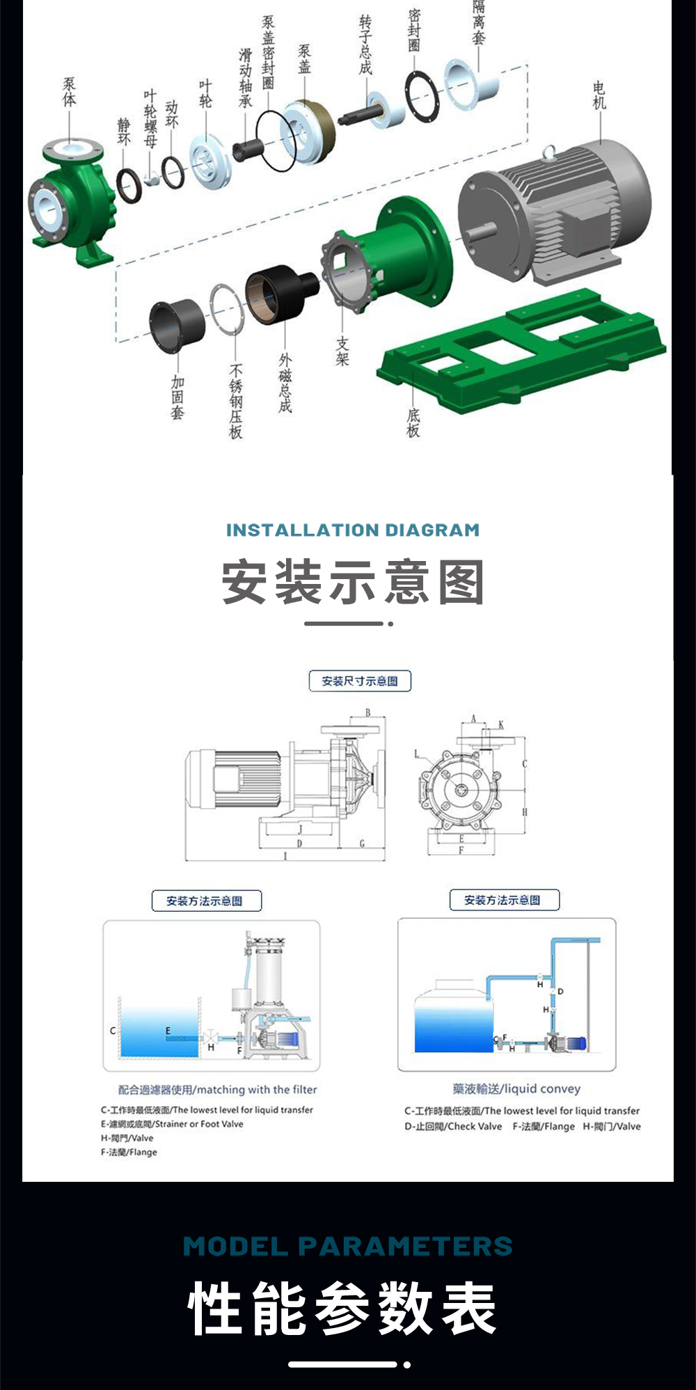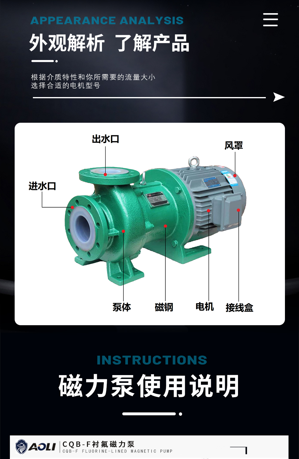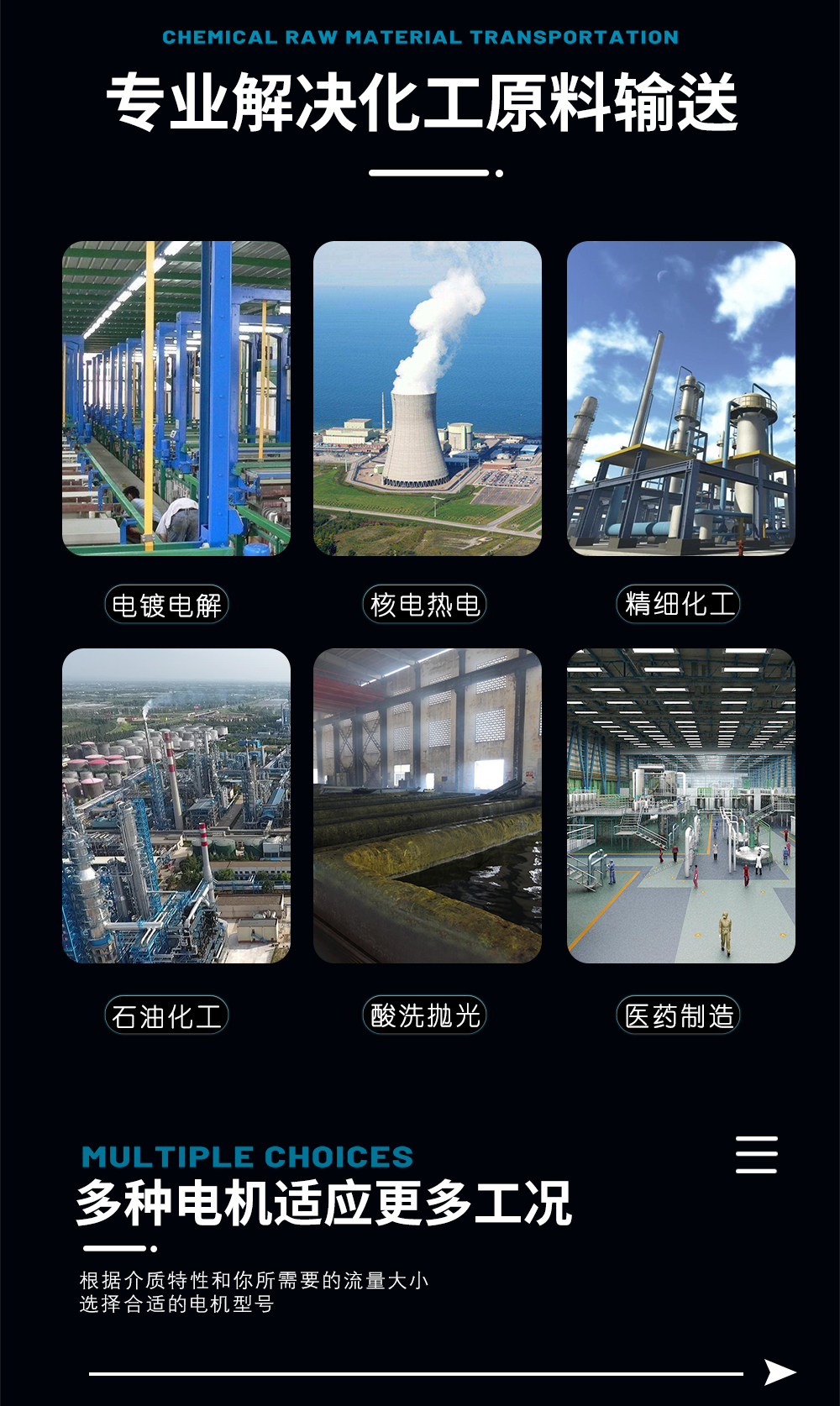 CQB-F氟塑料磁力泵采用磁力耦合傳動(dòng),不存在動(dòng)密封點(diǎn),因此防止了一般軸傳動(dòng)式離心泵軸封外跑、冒、滴、漏的現(xiàn)象的塑料磁力泵類(lèi)型。過(guò)流部件采用氟塑料及高純度工業(yè)陶瓷制成,具有優(yōu)異的耐腐性及密封性,因此本產(chǎn)品被廣泛適用于化工、制酸、制堿、冶煉、稀土、農(nóng)藥、染料、醫(yī)藥、造紙、電鍍、電解、酸洗、無(wú)線(xiàn)電、化成箔、科研機(jī)構(gòu)、國(guó)防工業(yè)等行業(yè)。可輸送介質(zhì):輸送任意濃度的酸性、堿性、油類(lèi)、稀有貴重液體、毒性液體、揮發(fā)性的化學(xué)介質(zhì)。特別是易燃、易漏、易爆液體化學(xué)介質(zhì)的輸送。