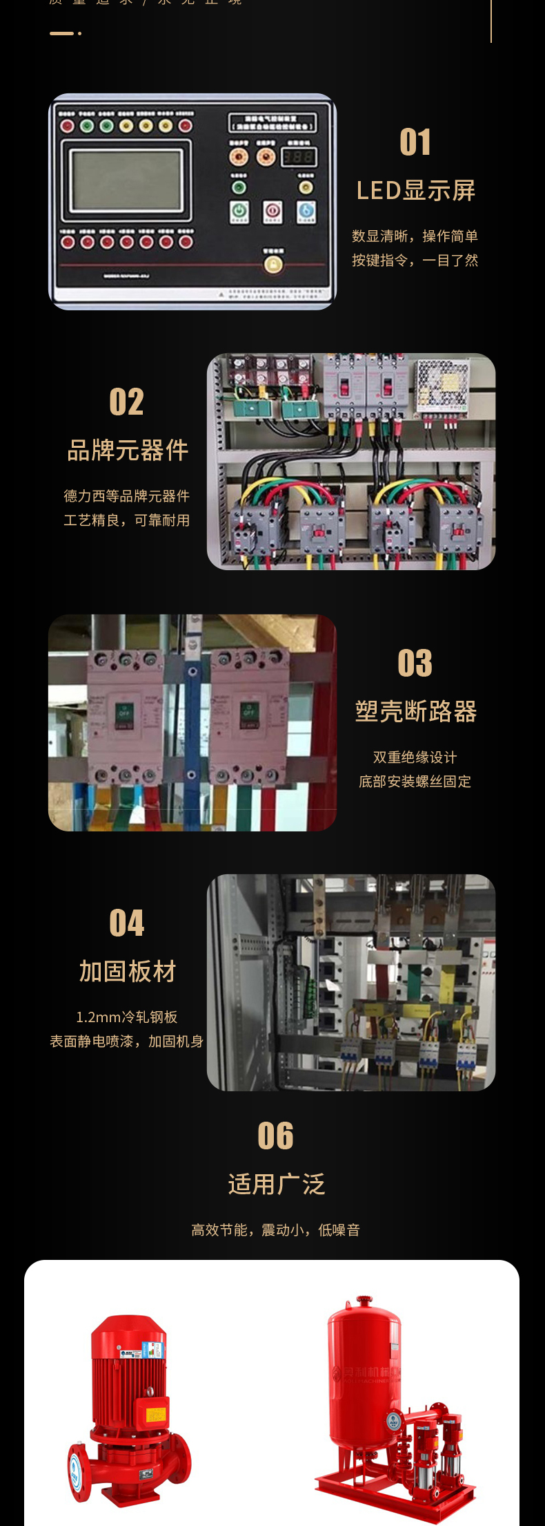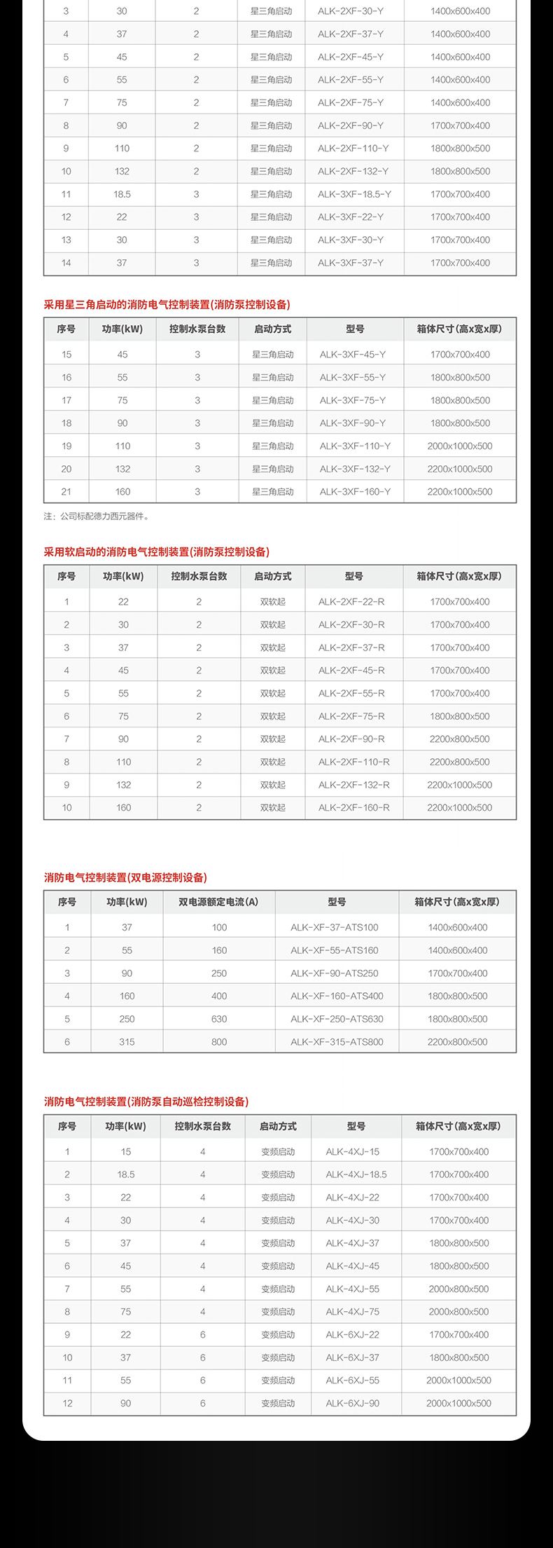 ALK系列消防電氣控制裝置(消防泵控制設備)均已獲得消防產品國家強制性產品認證證書(即CCCF認證),產品所依據的國家標準為GB16806-2006《消防聯動控制系統(tǒng)》。本公司的消防電氣控制裝置分為消防泵控制設備、消防泵自動巡檢控制設備和雙電源控制設備。消防電氣控制裝置(消防泵控制設備)起動方式有∶星三角降壓起動、直接起動、軟起動。消防電氣控制裝置(消防泵自動巡檢控制設備)均采用變頻起動,并以低頻巡檢運行,也可保證工頻負載運行時保持正常。